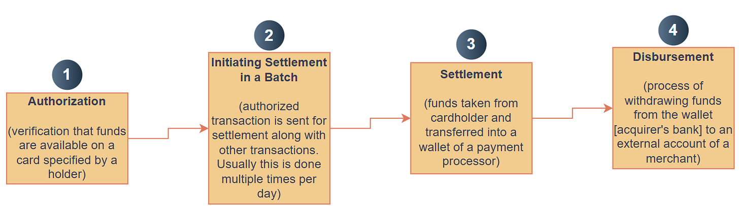 Such a step is always present, whichever payment processor you may choose. Here is a diagram of simplified steps involved in card processing that results in Wallet funding: